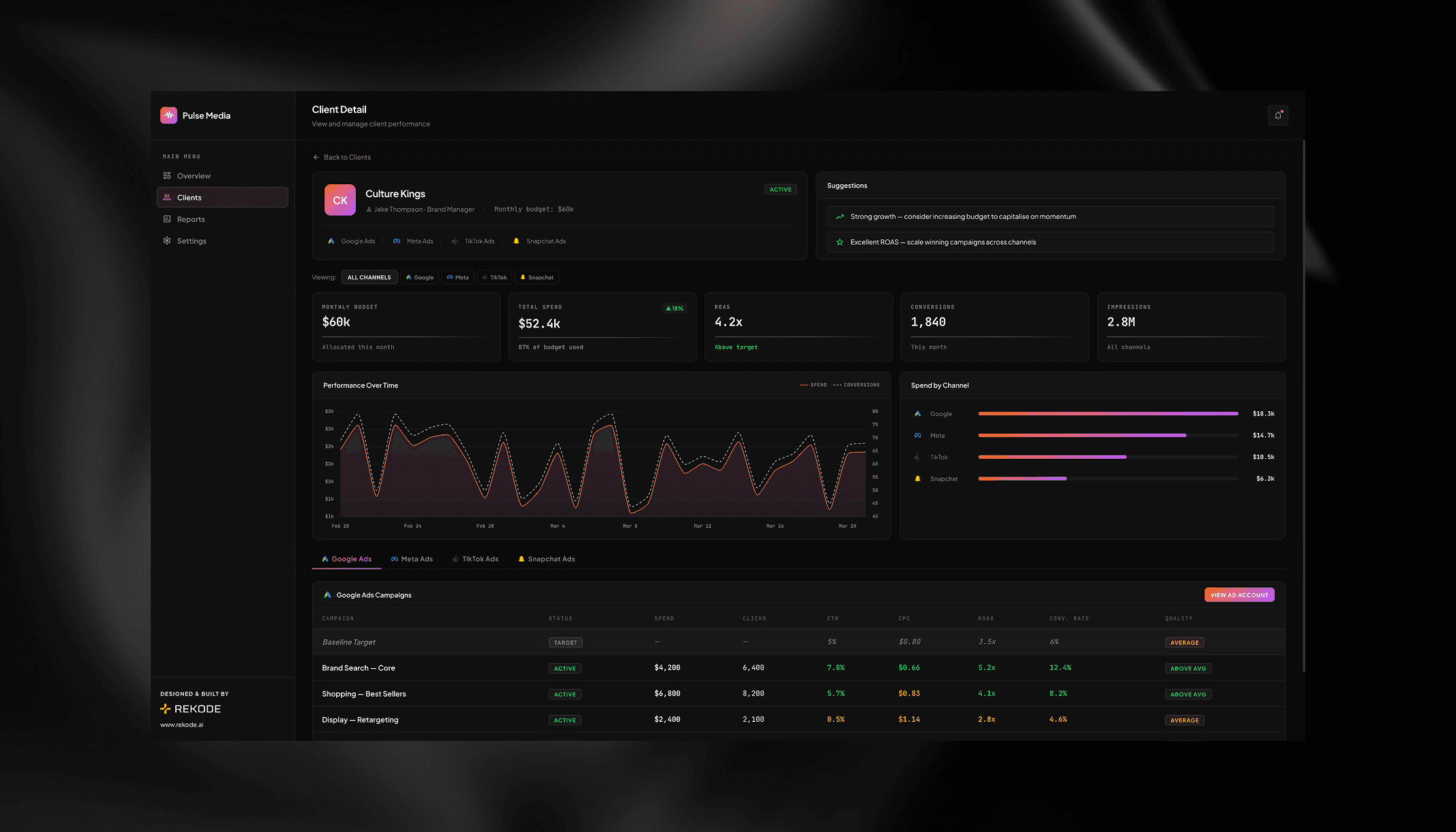 From the overview an agency owner can see how the entire business is performing across every client and every platform in a single view. Clicking into any client card opens a full performance breakdown by channel with campaign level data and AI generated suggestions for where to optimise spend.