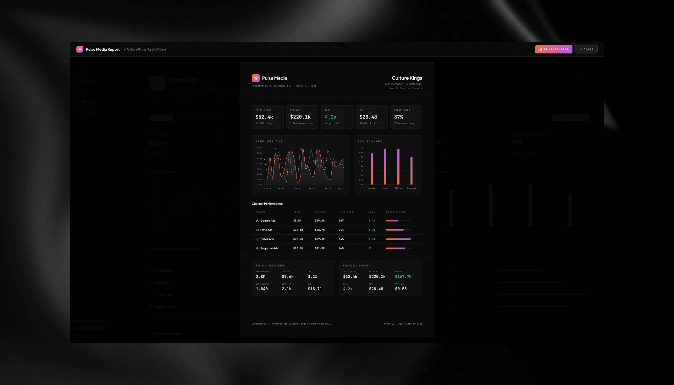 When it is time to report to a client, the reporting view generates a clean single page PDF with one click. No spreadsheets, no manual formatting, no time wasted.