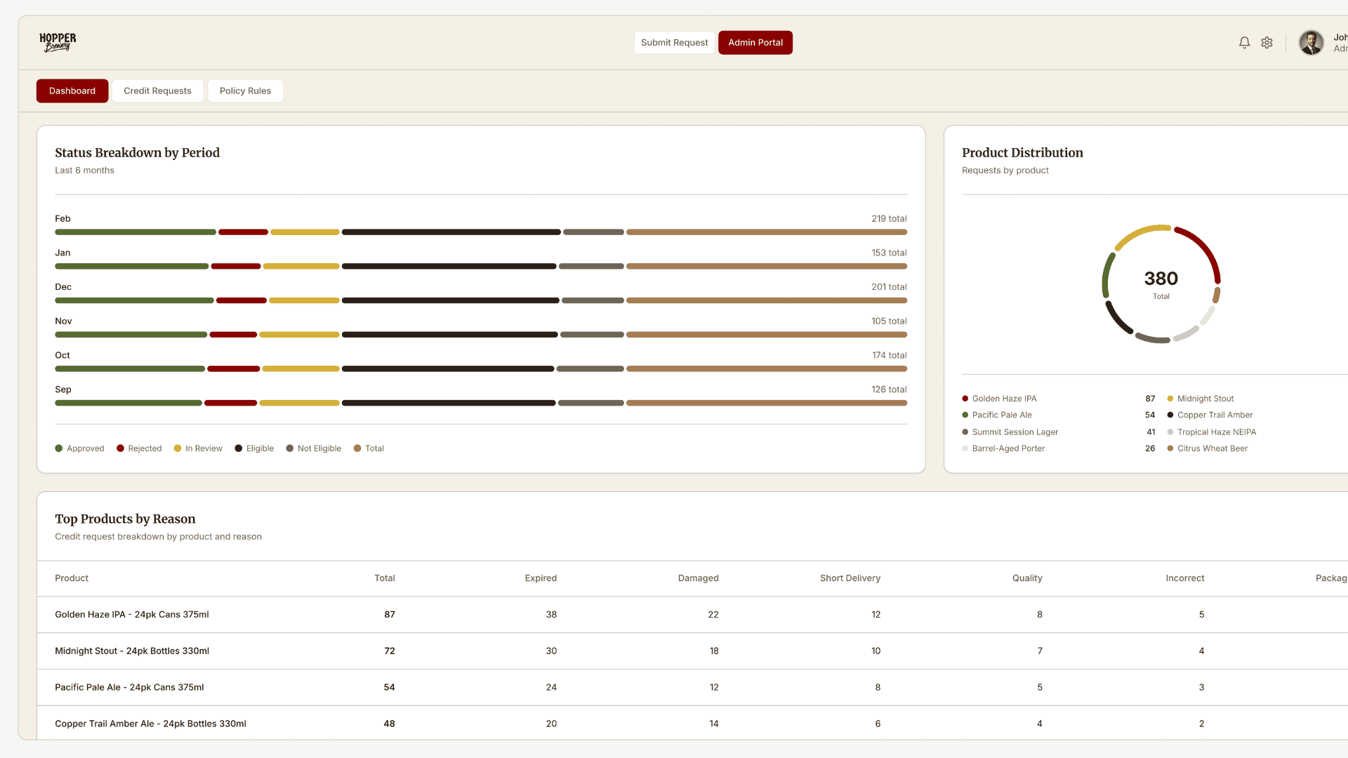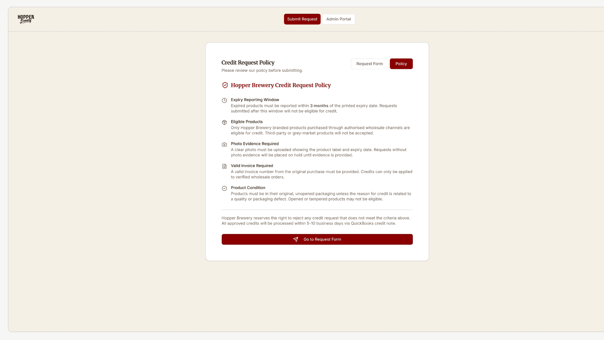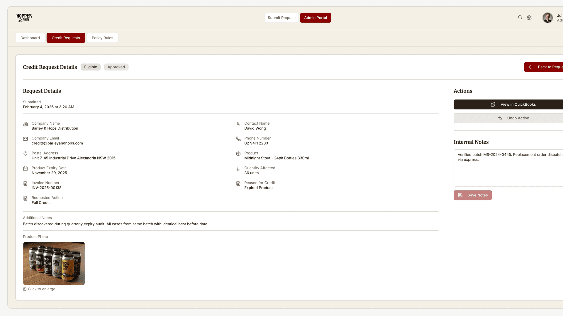 The Hopper Brewery portal demonstrates how a structured submission form and internal admin dashboard can replace inbox-based workflows. Vendors submit standardized credit requests aligned with company policy, while internal teams review eligibility, track status, and manage supporting documentation. Approved requests can automatically sync with accounting systems such as QuickBooks, generating draft credit notes and reducing manual financial processing.
